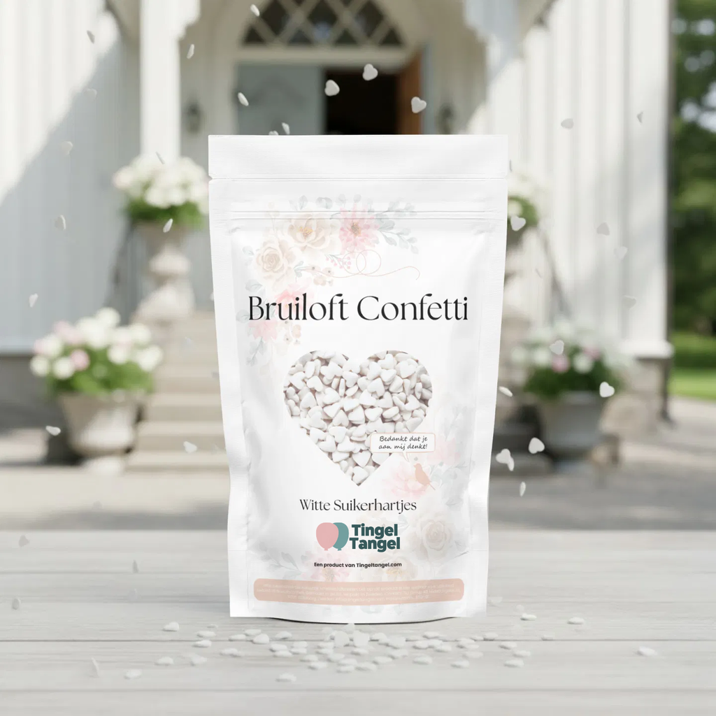 Bruiloft confetti in de vorm van kleine witte suikerhartjes. Deze kleine hartjes breken op natuurlijke wijze af en vormen daarom een uitstekend alternatief voor traditionele rijst. Veel kerken hebben het gebruik van rijst verboden omdat dit schadelijk kan zijn voor vogels en andere dieren. Een populaire en slimme keuze voor bruiloften.